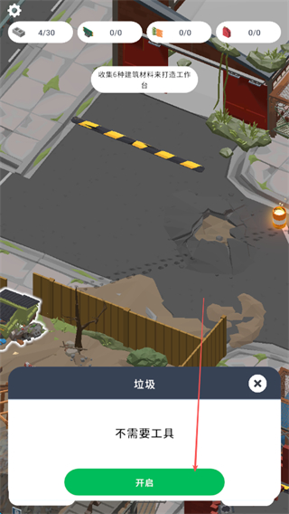 4、遇到垃圾区域时,点击开启按钮,无需工具即可获取资源,不断积累各类资源,为打造建筑和工具奠定基础。