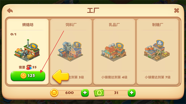 1、在工厂界面,当小镇达到对应等级且拥有足够资源时,如烘焙坊需小镇等级满足且消耗125金币,点击购买按钮。