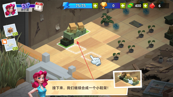 3、继续合并对应物品,合成出小鞋架,推进物品升级流程。