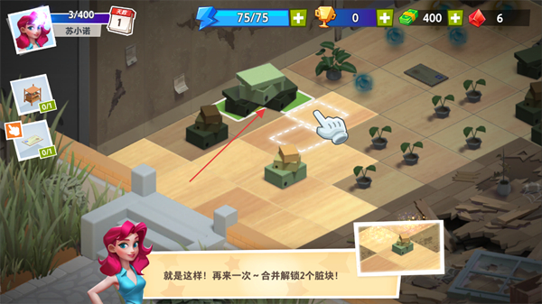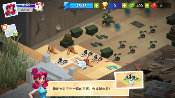 1、按照提示拖动三个相同物品,合并成新物品,完成基础合成操作。