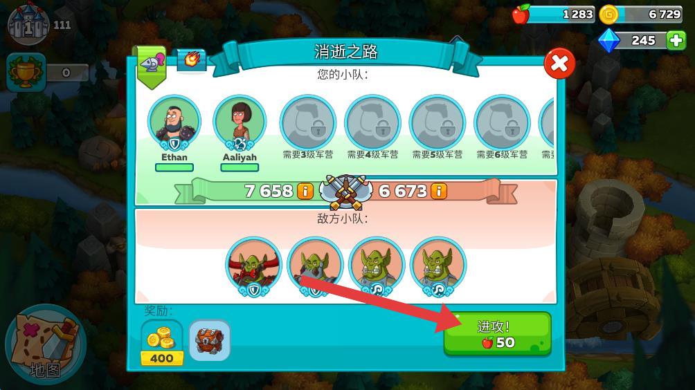 3、在地图中选择好战斗关卡,点击进攻。