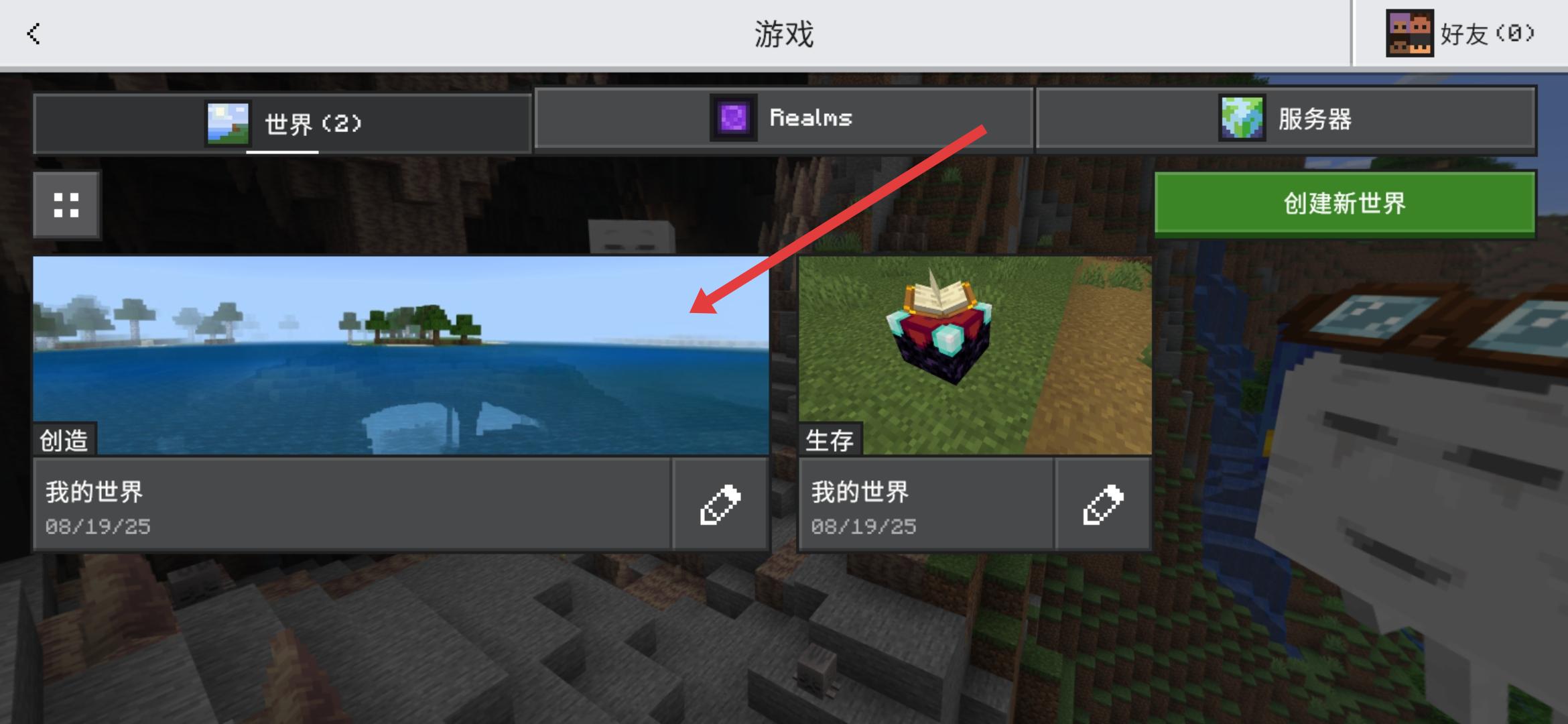 1、在游戏的主界面,先选择自己任意已创建的世界如创造模式的世界,点击进入游戏的场景。
