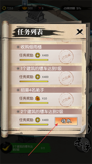 4、返回任务列表,点击领取按钮,获取对应任务的铜钱奖励。