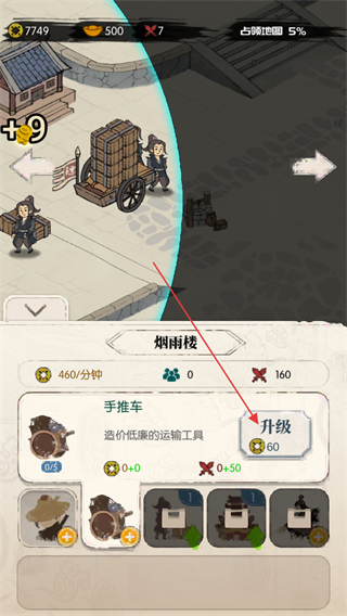 2、进入烟雨楼界面,点击升级按钮,提升手推车等级。