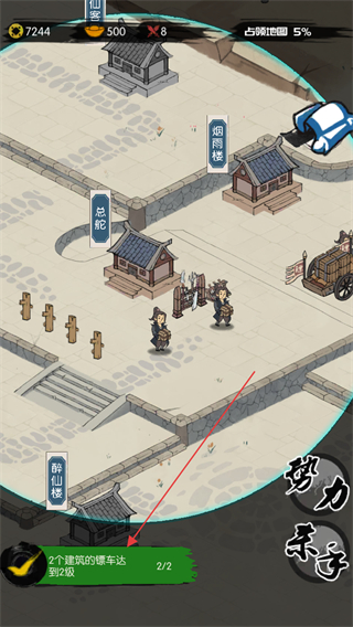 3、完成2个建筑镖车的升级后,查看底部提示确认进度。