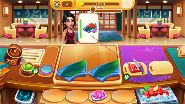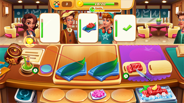 3、同时处理多位顾客的不同订单如寿司、抹茶,高效制作料理。
