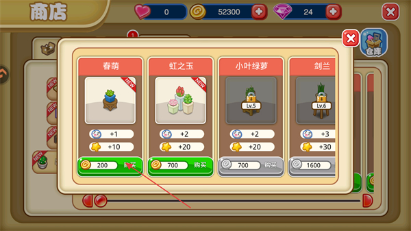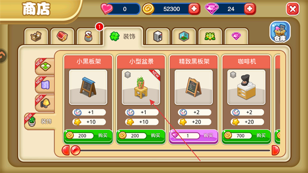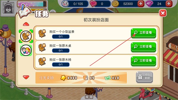 1、在初次装扮店面任务中,点击小型盆景对应的立即查看按钮,进入商店界面。