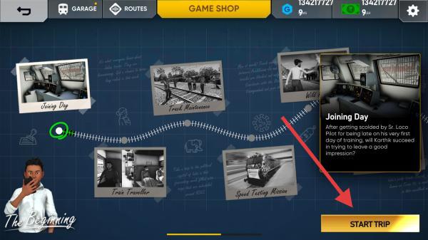 2、在章节地图中,任务以时间线卡片呈现,点击带绿色圆点的任务卡片,查看任务描述,再点击底部START-TRIP按钮,正式接取并进入驾驶环节。