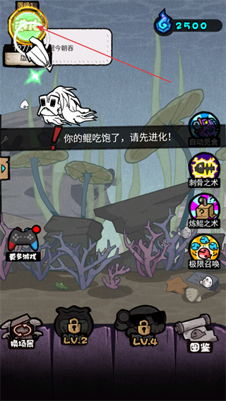 4、鲲吃饱后,点击左上角进化按钮,触发进化提示,推进鲲的进化流程。