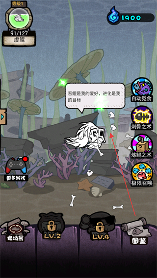 2、鲲提示吞噬是进化目标,继续让鲲吞噬,进度更新为91/127,积累资源。