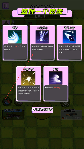 4、升级后选择技能如一触即电,增强战力,持续突围打怪。