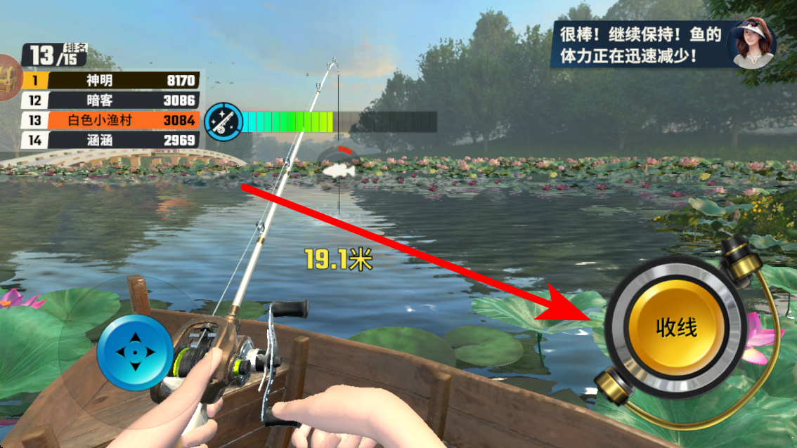 4、最后进行收线,当有鱼上钩后,点击收线按钮,通过收线来逐步将鱼拉向自己,完成钓鱼操作,感受收获的喜悦。