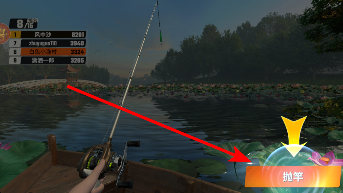 3、接着进行抛竿,在合适的时机,点击界面上的抛竿按钮,将鱼钩抛入水中,开启钓鱼的过程,等待鱼上钩。