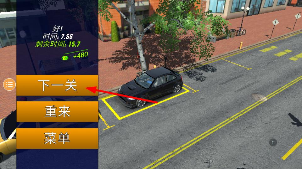 3、在停车关卡完成后,点击下一关按钮,可进入后续关卡继续挑战,这是推进游戏进程的关键的操作。