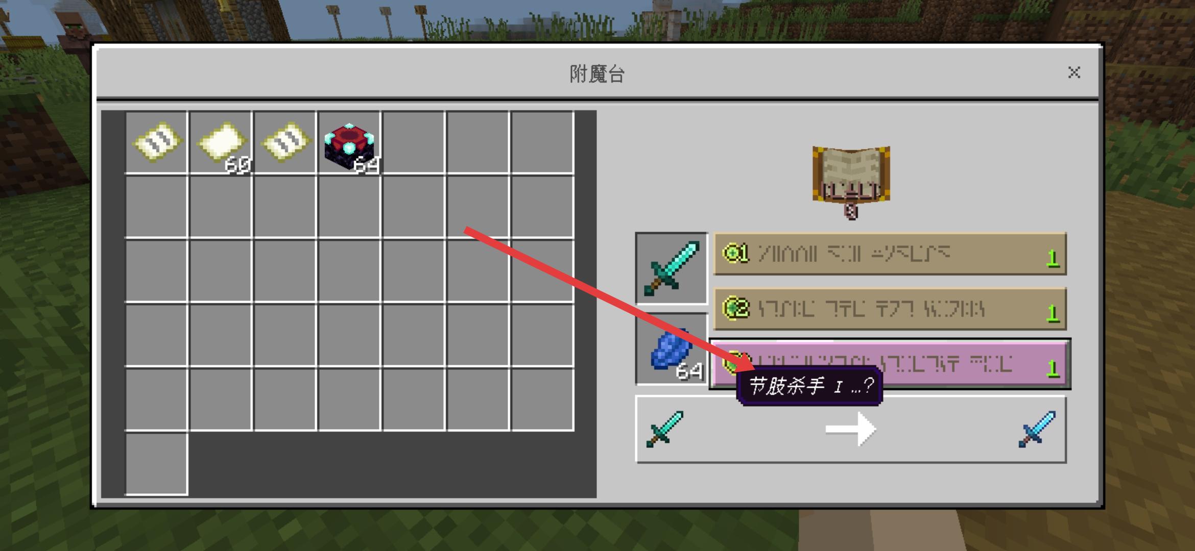 2、点击附魔台打开界面,将待附魔物品拖入左侧物品槽,放入1-3块青金石,右侧随即生成3个随机附魔选项,悬停选项可查看其中一个魔咒。