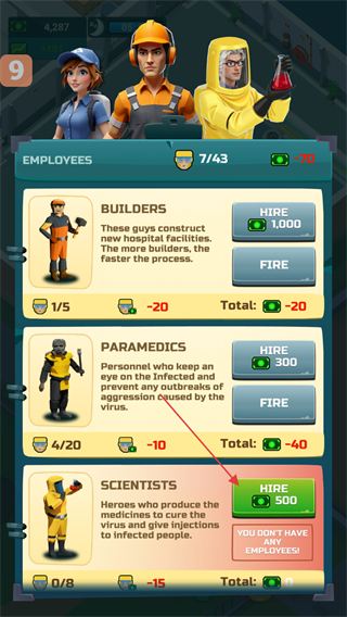 4、进入雇员界面,找到SCIENTISTS选项,点击HIRE按钮招募科学家助力研发。
