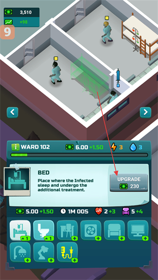 2、找到BED设施,点击UPGRADE按钮花费230资源升级病床,提升治疗效果。