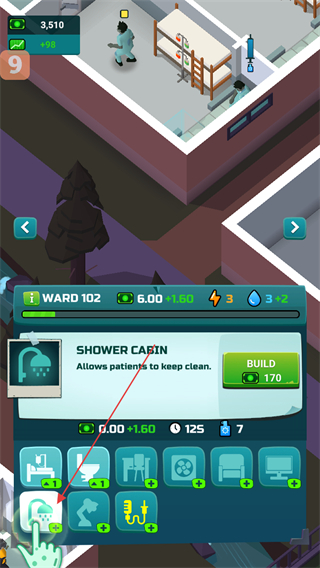 3、在设施列表中找到SHOWERCABIN,点击BUILD按钮花费170资源建造淋浴舱。