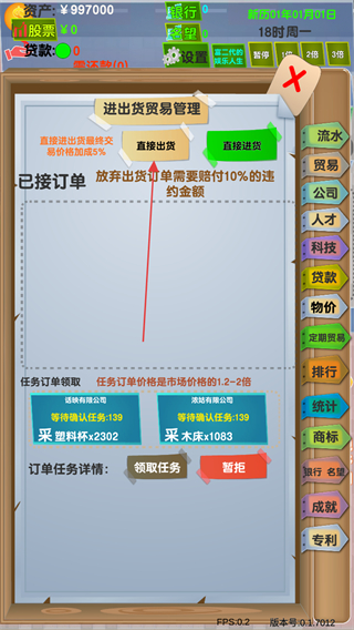 3、在贸易管理中,选择直接出货,领取订单任务,如采集塑料杯、木床等。