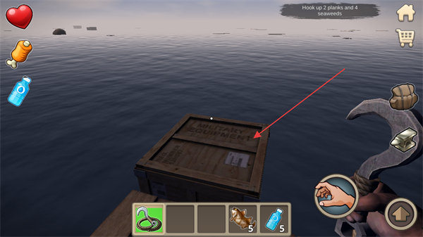 4、钩取木箱类物资,打开可获取更多资源,推进生存进度。