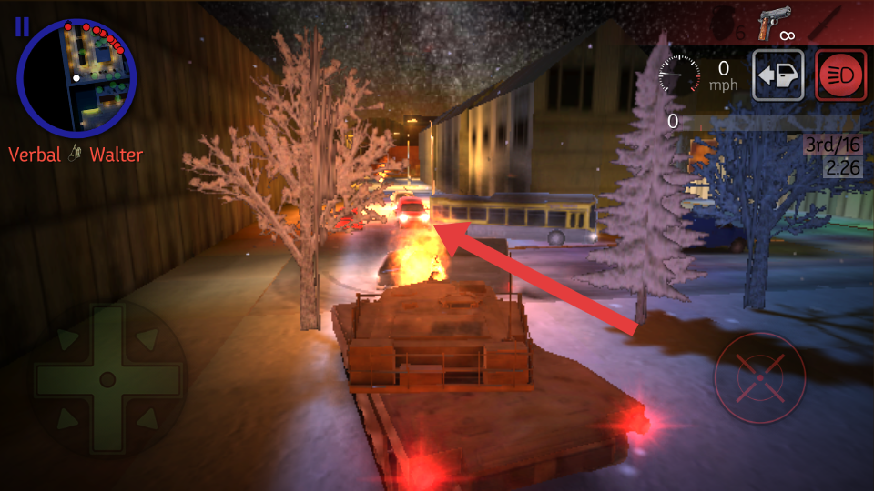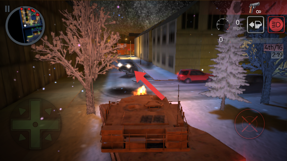 2、遇到箭头指向的燃烧车辆等目标时,调整坦克位置,瞄准目标后射击,清除前方障碍,推进游戏进程。