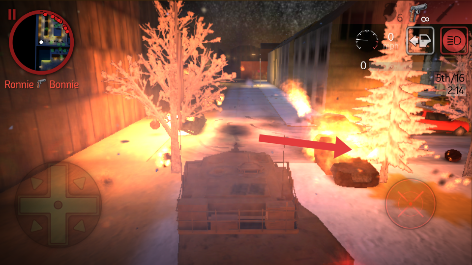 4、面对箭头指向的燃烧障碍物或敌方目标时,驾驶坦克靠近,瞄准后射击,摧毁目标,为后续行驶开辟道路。
