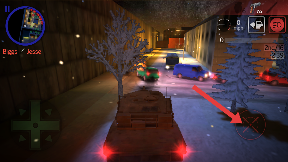 1、在城市街道驾驶坦克时,瞄准箭头指向的目标区域,点击射击按键,向目标发起攻击,对敌方车辆造成伤害。