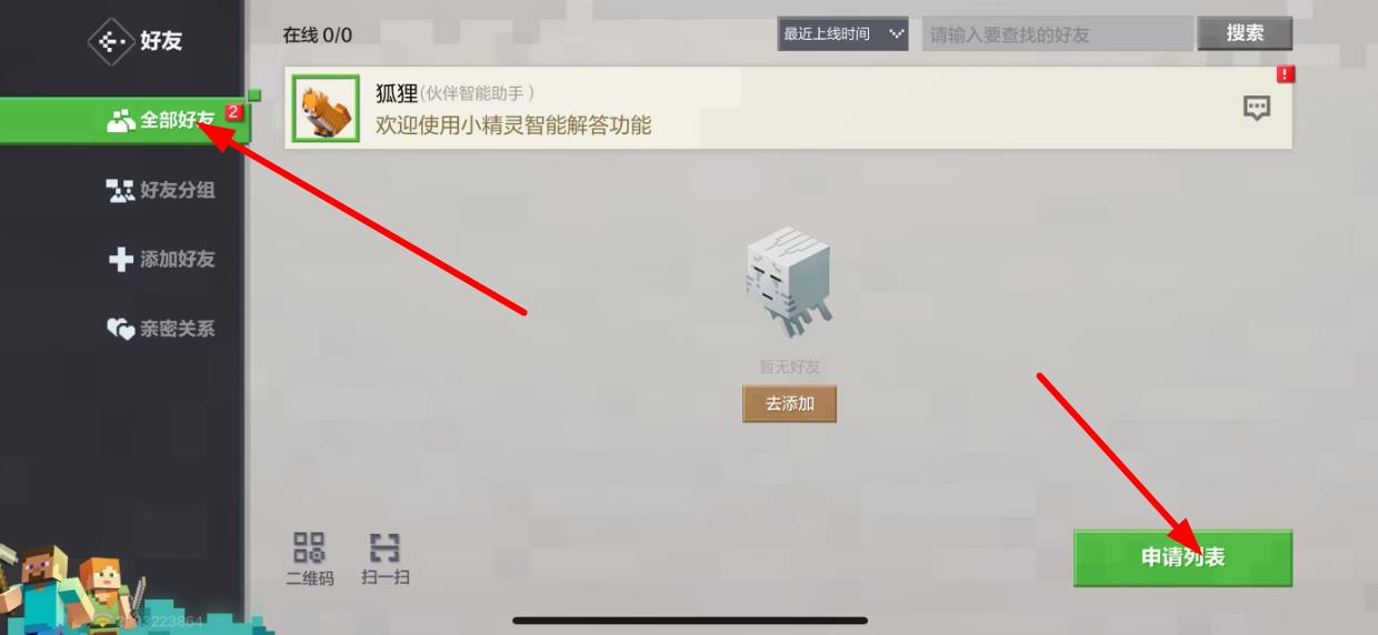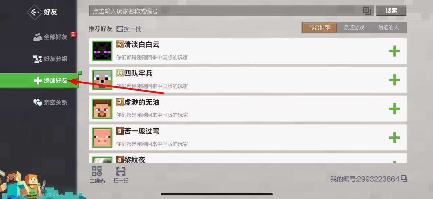 1、进入我的世界游戏,点击下方好友图标,进入好友界面后,点击左侧列表中的添加好友选项。