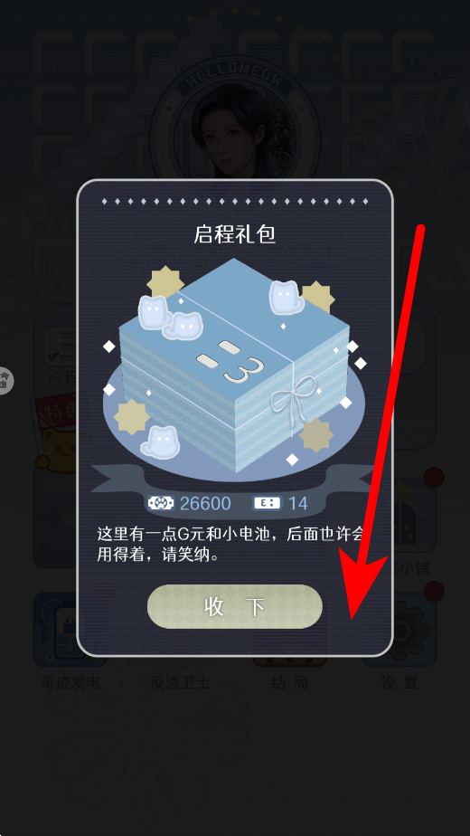 3、当出现福利礼包,像启程礼包时,点击收下按钮,就能获取礼包内的G元、小电池等资源,这些资源后续能派上用场。