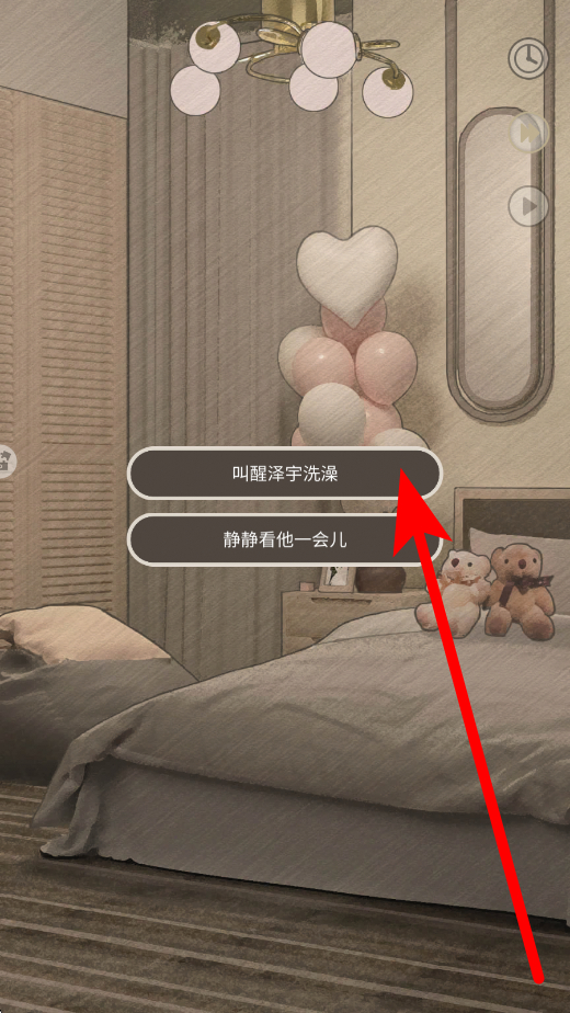 1、主线选择出现分支时,比如有叫醒泽宇洗澡、静静看他一会儿等选项,根据自己的想法点击对应选项,就能决定剧情的走向。