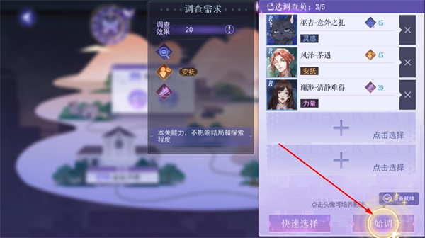 3、在调查准备页选择对应能力的调查员,点击开始调查进入。