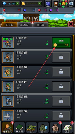 4、在这名士兵界面,花费金币升级培训师,提升士兵的伤害和生命值等属性,增强战斗力,助力关卡推进和角色成长。