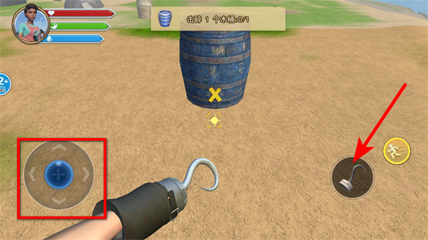 2、在岛屿场景中,通过左侧摇杆移动,点击右侧钩子按钮,击碎木桶等物品。