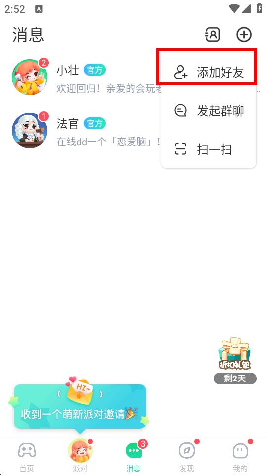 1、打开会玩app,进入主界面后点击底部导航栏中的消息选项。
