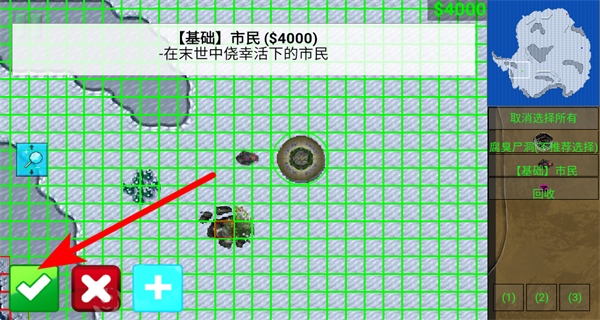 3、点击对勾按钮建造基础市民,该单位是在末世中侥幸存活的市民,是发展的核心力量,需优先建造以推进游戏进程。