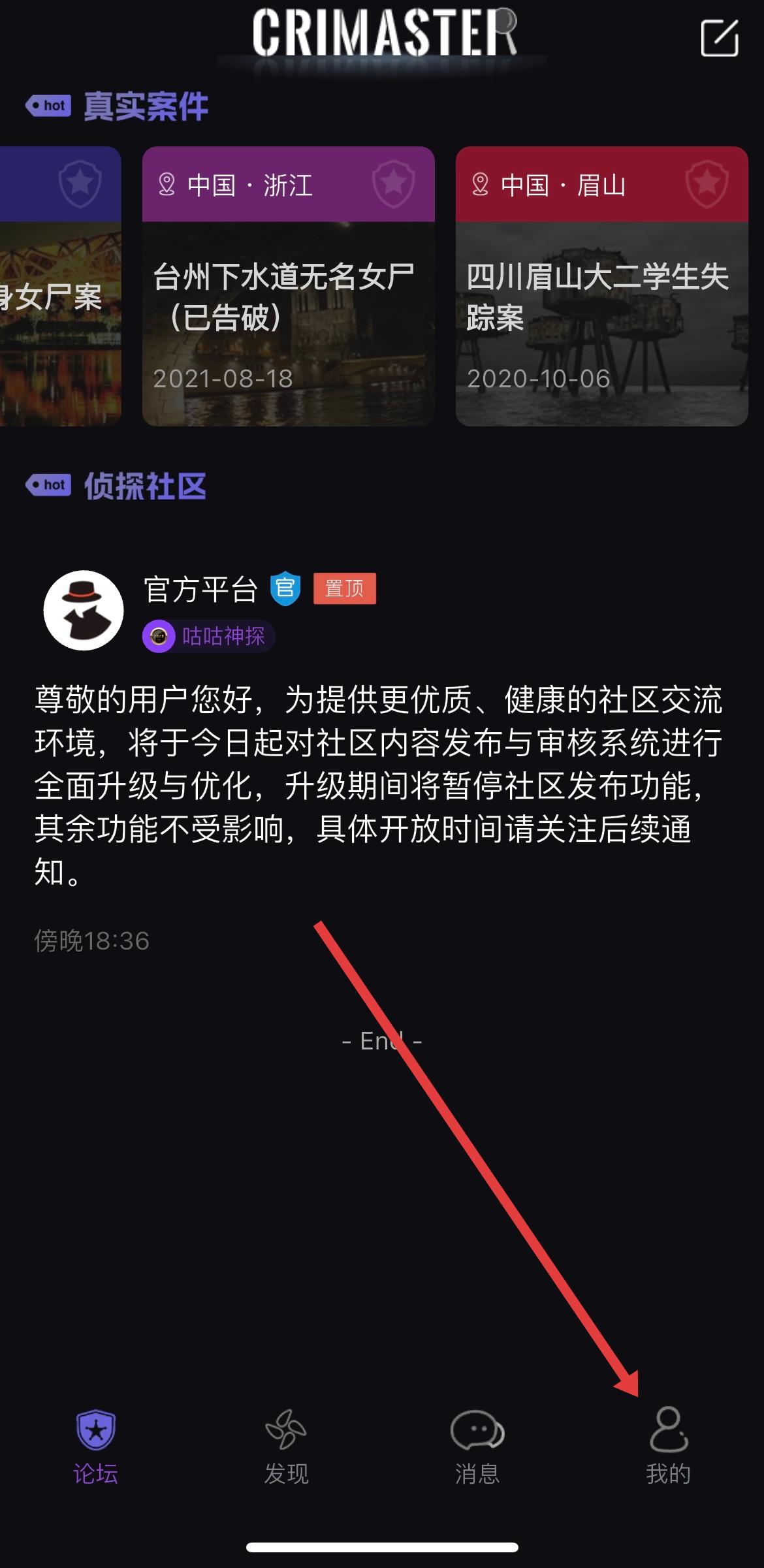 1、打开犯罪大师CRIMASTER,进入首页后,找到底部导航栏中我的,并点击,进入个人主页。