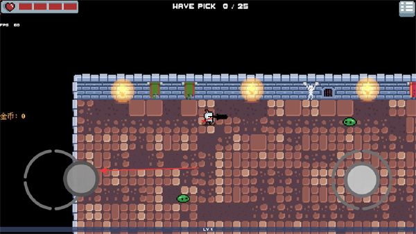 1、操控左侧移动摇杆控制角色移动,右侧摇杆控制攻击方向,在地牢中探索并消灭绿色怪物。