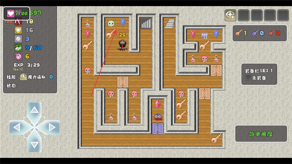 1、操控摇杆移动角色,在迷宫区域探索,收集钥匙等道具,推进流程。