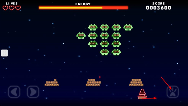 2、在游戏界面中,点击右侧发射按钮,控制飞船发射子弹消灭外星机器人。