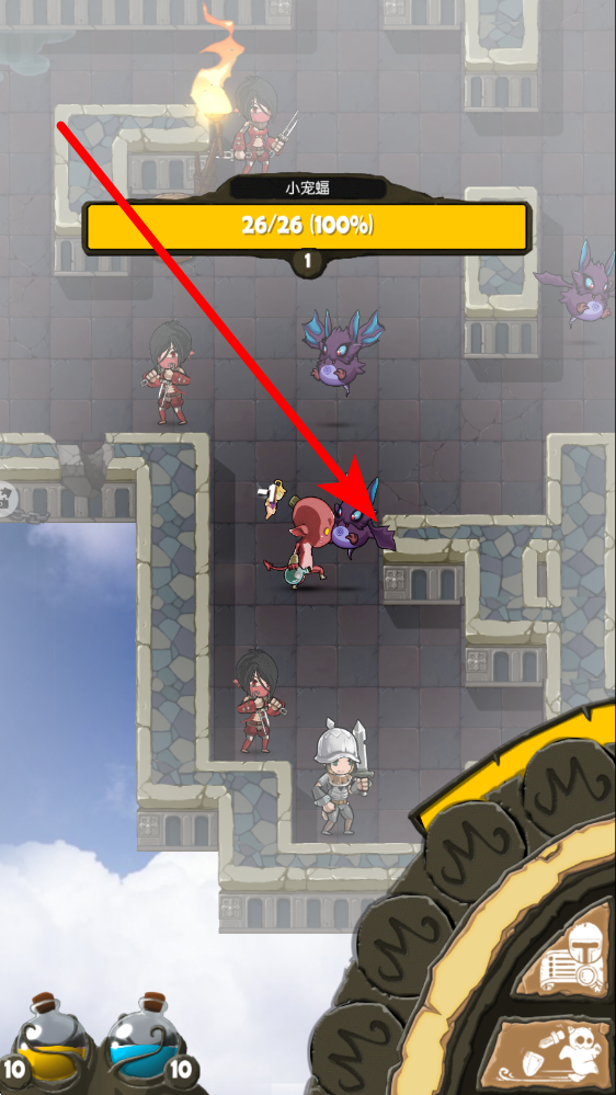 3、进入高塔场景,控制小怪兽与敌人战斗,探索随机生成的关卡,遭遇小宠蝠等敌人,通过战斗推进,解锁新区域,开启冒险之旅。