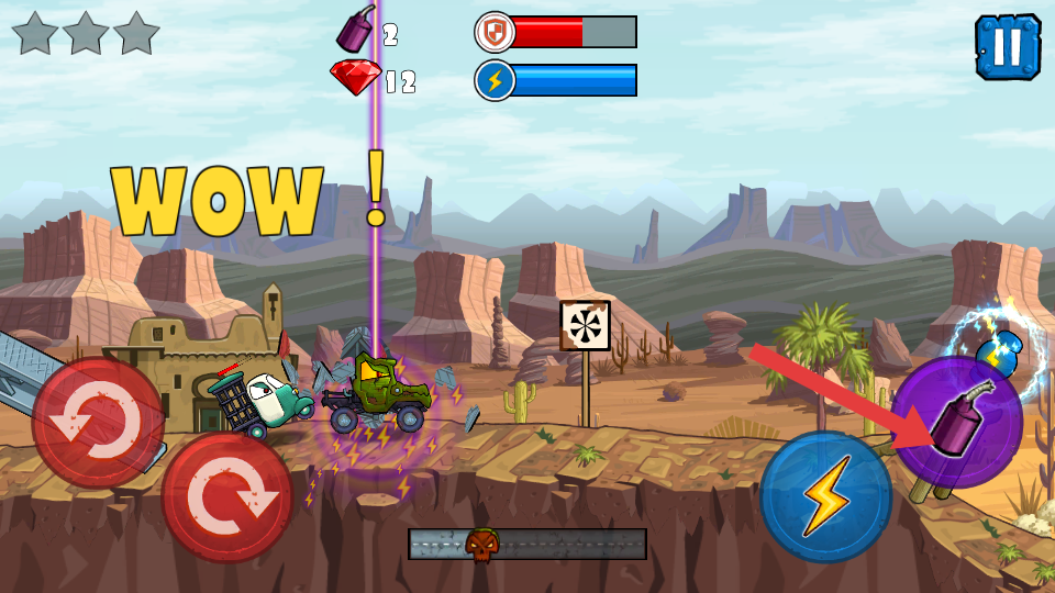 1、核心操作与闯关流程:进入关卡后,左手控制赛车旋转调整重心适应上下坡,右手点击加速键提升车速,遇敌人时释放炸弹摧毁目标,躲避障碍并吞噬车辆。