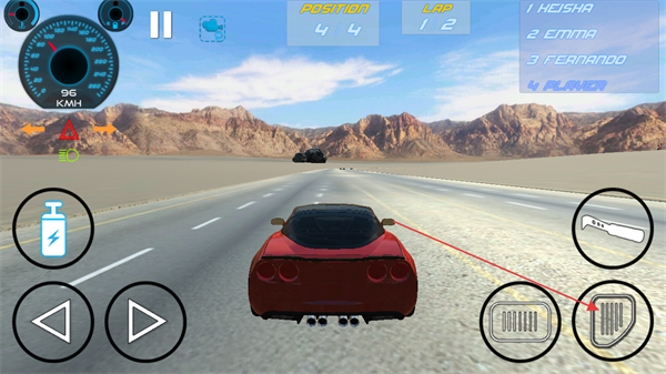 2、点击右侧油门按键加速,通过方向盘和左右方向键调整跑车行驶方向,超越对手。