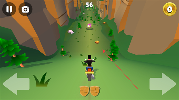1、操控摩托车在峡谷道路行驶,收集金币和道具,注意避开树木等障碍物。