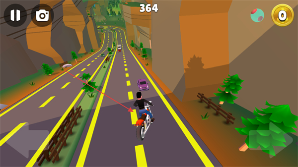 2、在公路上骑行,躲避车辆,保持行驶速度,积累分数。