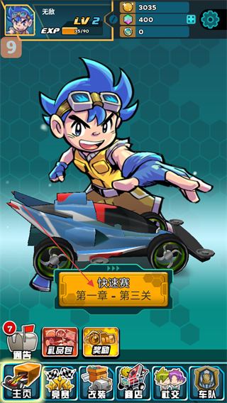 1、在主页界面,点击快速赛选项,即可进入对应关卡的赛事准备环节,推进四驱车竞速的游戏进程。