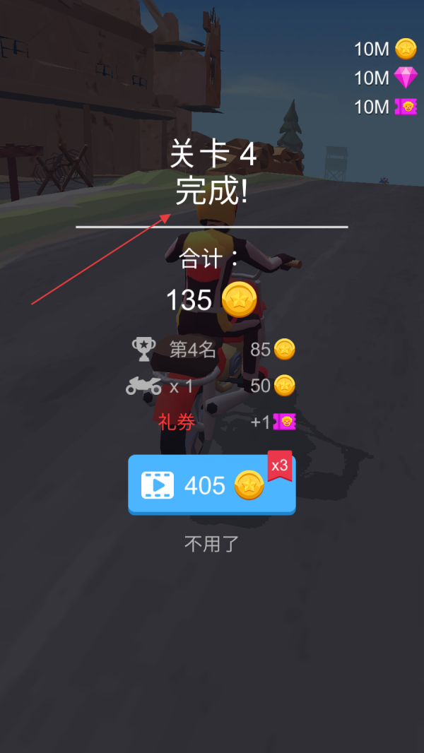 4、冲过终点线后游戏会弹出关卡完成界面,界面上会显示本次竞速获得的金币数量、礼券奖励以及用时数据,查看完奖励信息后点击下一关按钮进入关卡4的准备界面。