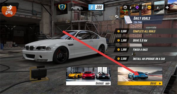 1、在游戏主界面,点击右下角的DRIVE按钮,进入赛道选择环节。