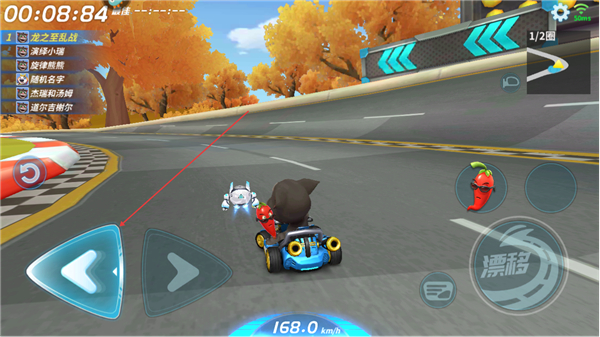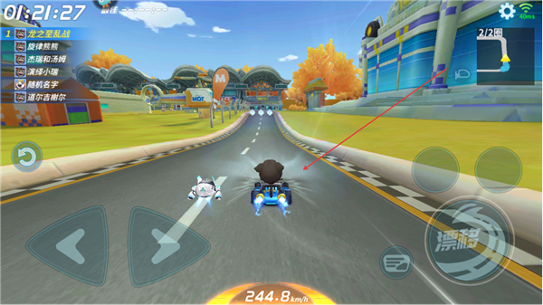 3、在赛道中点击漂移键完成漂移,积累加速能量提升车速,同时按提示完成操作,保持领先节奏。