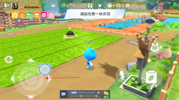 1、进入游戏,看到提示请前往第一块农田,点击屏幕虚拟按键操控角色移动。