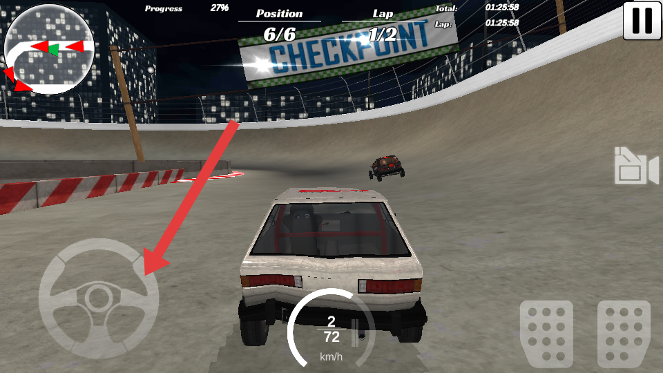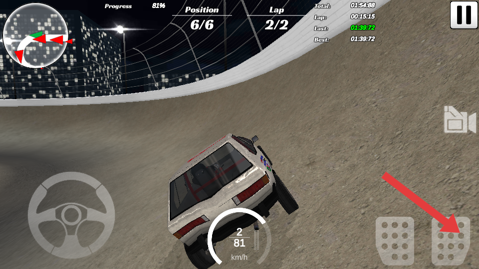 1、在赛车行驶过程中,点击箭头指向的右侧操作按钮,可控制赛车加速,助力赛车在赛道上快速前进,提升比赛中的速度优势。